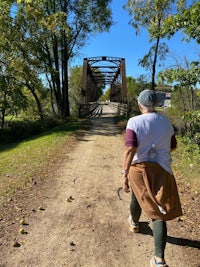 I felt great walking today!! No issues with feet and overall the body felt like walking. It was probably due to the wonderful Wisconsin Badger Trail we got to walk on today!! It was gorgeous!! Such a welcome surprise and needed break from the pavement. I clocked in 17.1 miles total today, walking through Belleville and Monticello. Joan walked the first 9 with me, and then around noon we called Clarence to pick her up as her knees were hurting. In order to make it to our arranged stopping point for lunch and to get in the amount I needed to do today, I continued on walking what I thought would be the 1-2 additional miles. After I left, we learned that Clarence for some reason was 35 miles away and eta to Joan was 50 minutes. I decided to just keep going as long as I could. There was a paved road beside the trail that was running parallel so I decided to hop off the trail and get to the road because it would be easier for Clarence to pick me up from. At 12.6 miles, around 12:50 I hit my max. I passed a mailbox and looked up the road to see how far away the house was. I was actually considering going up to the house to ask if I could sit down until Clarence arrived! I couldn’t see the house from the road and there was no access back to the trail so I marched on. The very next mailbox I again looked up the road. This time the house was close and there was an access route back to the trail so I knew this would be the one. I was really going to do this! I turned up the driveway but was met by two barking German Shepherds!! Uh oh I thought, this could be trouble!!! I easily won over one of them but the other was still protecting the house with fervent barking. I decided to see what would happen if I continue to approach. Luckily, as I did, the second German Shepherd retreated. He was protecting the house, but didn’t know what to do beyond that. I walked up the steps of the porch and knocked on the door. There was no answer. They had beautiful patio furniture with padded seating so I daringly decided to sit down for the 15 minutes until Clarence came. I can’t believe I did that!!!