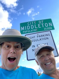 Joan and I walked 15.2 miles today. The weather today was much more cool with a nice wind that kept swirling behind our backs. Wish that helped as much as being on a bike!!😉 Stopped at Walgreens first thing for corn treatment products and that helped big time. I still have them, feel them, but they are not as painful at all. Can’t believe I walked all the way to Middleton WI (Madison) in one week!!! Clarence did another bang up job getting us to and from our starting point, half way lunch spot and being there at our planned finish point of the day. We’re getting better at a routine. Ruben was at the finish point, which was at a park, and ran to me when he saw me. Melts my heart every time. We started walking back to the RV and he marched ahead running towards it. It must already feel like home!! We put two recliners in the RV and took out the loveseat so I am in a recliner for our ride to and from our walking route. Ruben is right by my side along for the ride! What a trooper he is. One week in the history books, 14 more to go!